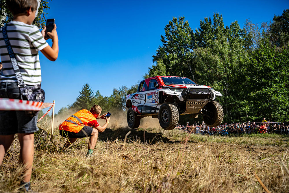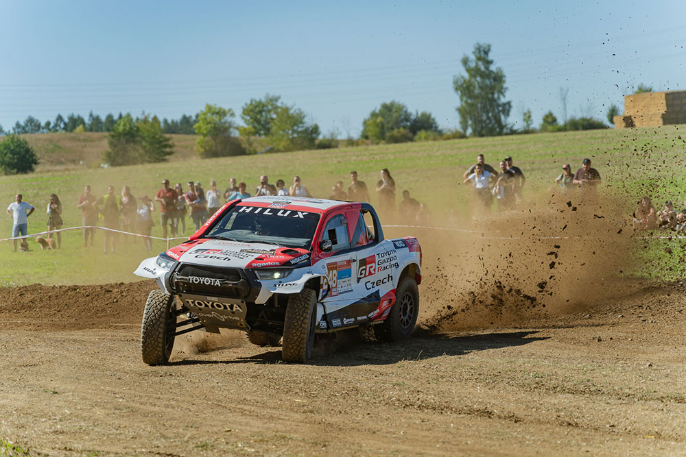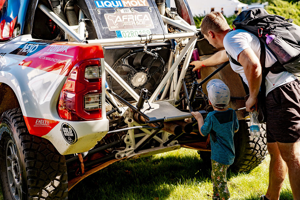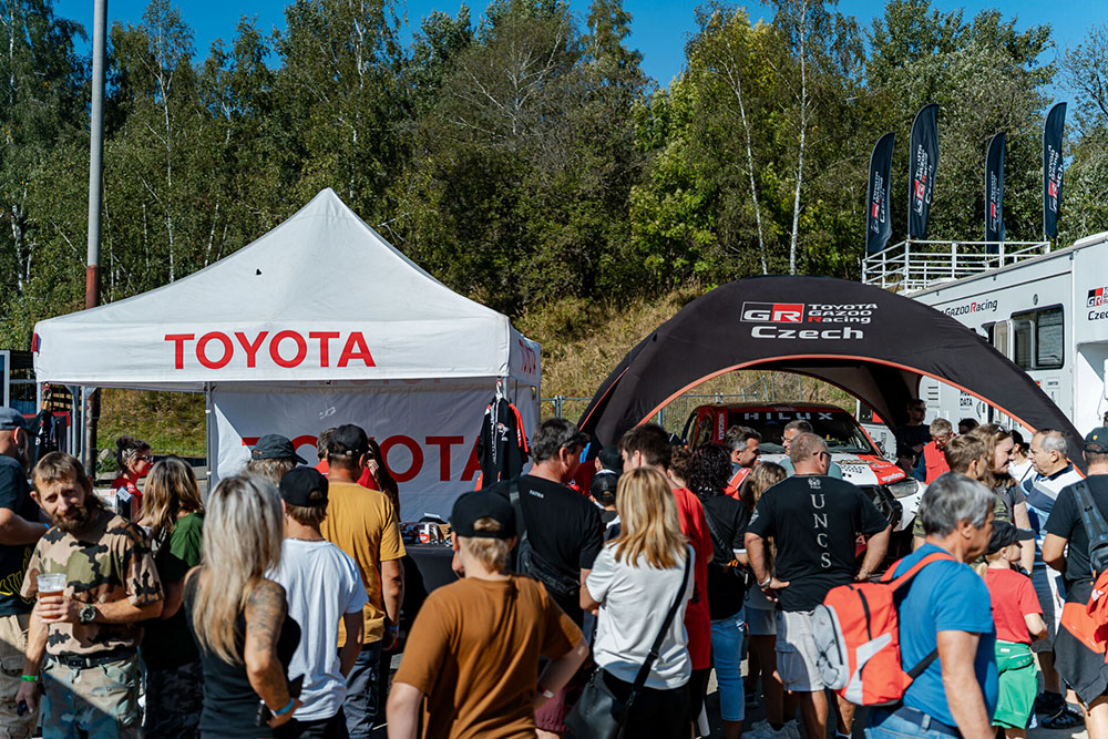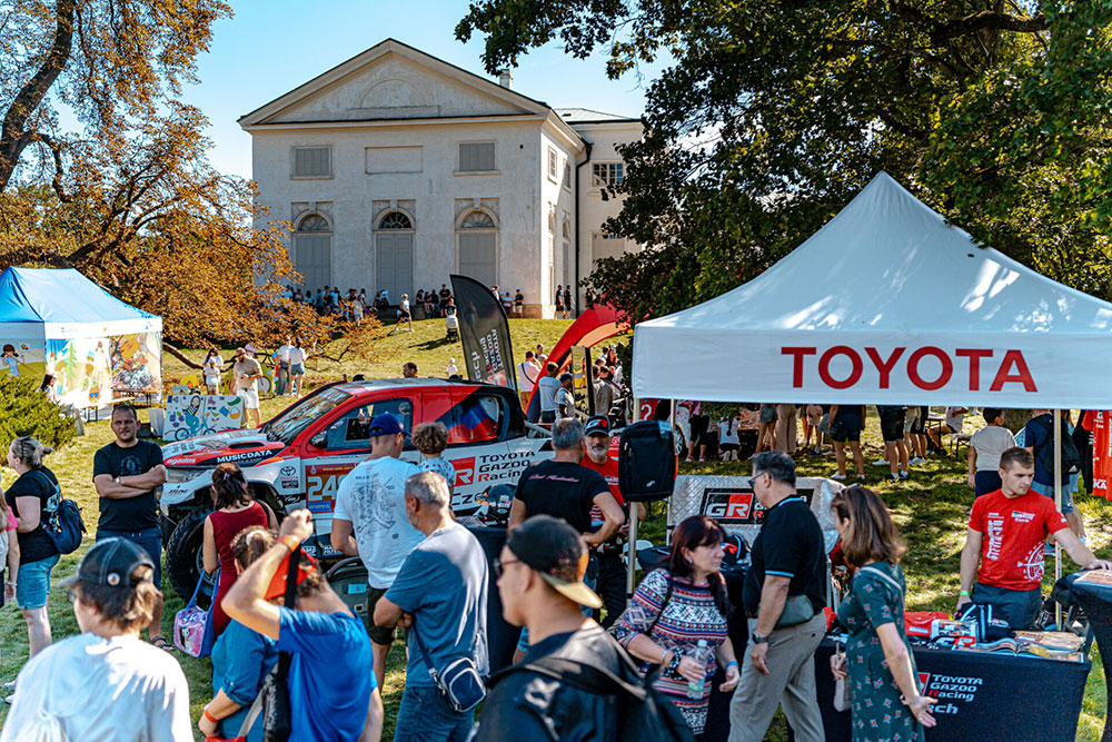 Park se rozezněl hudbou, provoněl vůněmi světové gastronomie a ožil divadlem, akrobacií i dětskými atrakcemi. Zlatým hřebem byla letecká show Petra Kopfsteina a koncert Marka Ztraceného. Uprostřed toho všeho jsme měli tu čest představit náš dakarský speciál Toyota Hilux GR T1+. Auto, které jezdí pouštěmi a skáče přes obrovské kameny, se na chvíli stalo němým šperkem zámeckého parku – kontrast, který uchvátil dospělé i děti. Naši fanoušci se zastavovali na focení, okukovali detaily vozu a ptali se na zážitky z Dakaru.
